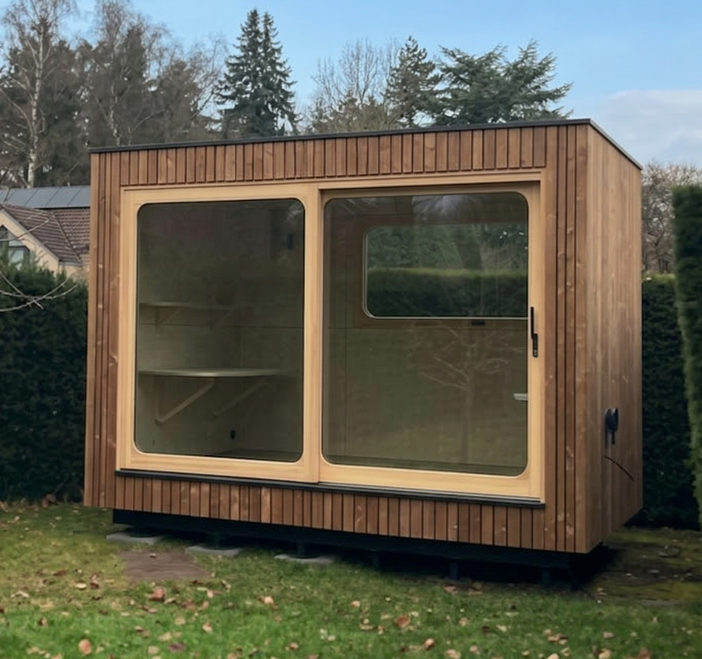 - Finition intérieure : murs en pin perforé + parquet chêne semi-massif